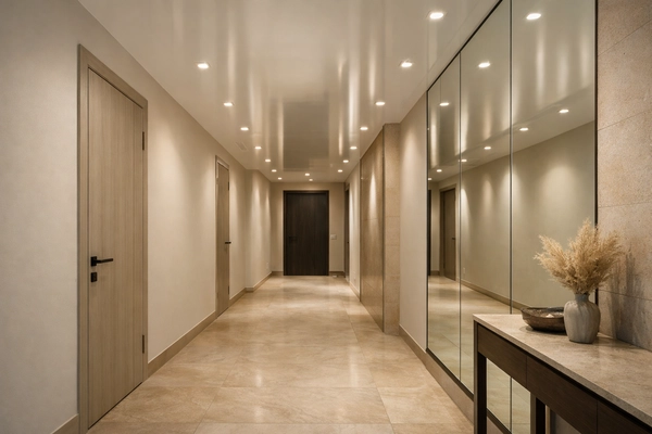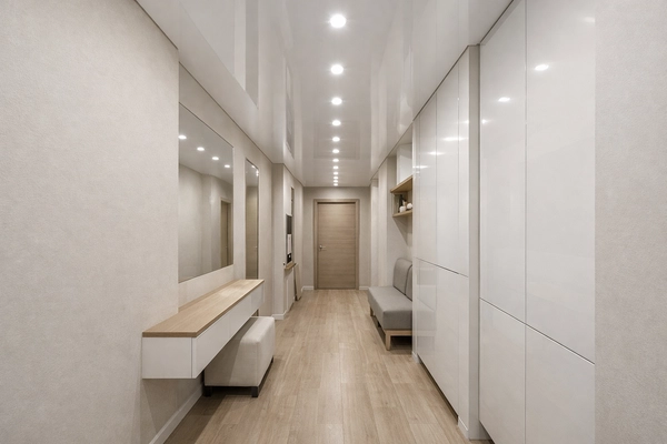Глянцевые и светлые полотна работают как отражающая поверхность: они усиливают освещение и визуально приподнимают потолок. Даже небольшая прихожая становится светлее и воспринимается более просторной. Это особенно актуально для типовых квартир с узкими коридорами.