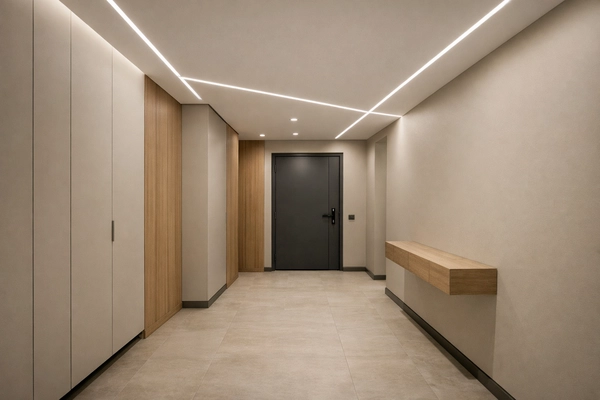 Мы заранее определяем расположение каждого светильника, чтобы исключить затемнённые участки и обеспечить комфортное освещение без резких теней. В результате прихожая становится функциональной, визуально просторной и удобной в ежедневной эксплуатации.
