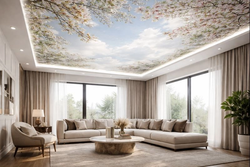 Он делает комнату светлее, подчёркивает современный стиль и отлично смотрится с точечным освещением. Хороший выбор для небольших помещений, где важно «добавить воздуха» и объёма.